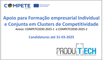 Foi publicado recentemente o Aviso COMPETE2030-2025-1 do Portugal 2030 com a designação SIQRH - Formação empresarial individual clusters que consiste no apoio para Formação de ativos – empresários, gestores e trabalhadores – das empresas inseridas em Clusters de Competitividade, nos quais se insere o Cluster PRODUTECH, estando por isso especialmente concebido para empresas diretamente relacionadas com o Cluster das Tecnologias de Produção ou com atividade relevante a montante ou a jusante.