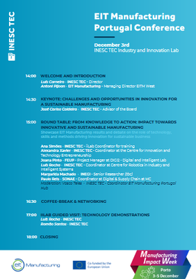 Realizado no novo Laboratório de Indústria e Inovação do INESC TEC, no dia 3 de dezembro (mapa), o evento conta com debates liderados por especialistas, incluindo uma keynote sobre desafios de inovação, uma mesa redonda sobre a tradução de conhecimento em práticas de impacto e uma mostra dos mais recentes resultados do projeto do EIT Manufacturing. Não perca as demonstrações tecnológicas exclusivas e as oportunidades de networking que o conectarão a parceiros em sustentabilidade e inovação de fabricação.