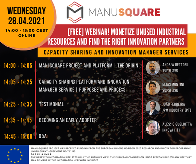 Consórcio Europeu MANU-SQUARE, do qual a PRODUTECH é parceira, está a organizar um webinar no próxima dia 28 de abril pelas 13:00h (hora Portuguesa) para a apresentação de dois serviços da Plataforma MANU-SQUARE, nomeadamente o serviço CAPACITY SHARING e o serviço INNOVATION MANAGER (NOVO serviço/ferramenta).